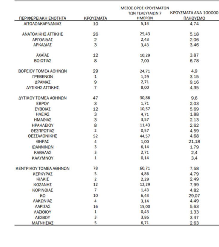 Βάσει αυτών, ο πίνακας που καταγράφει τον δείκτη θετικότητας ανά περιοχή, σύμφωνα με τον ΕΟΔΥ, διαμορφώνεται ως εξής: