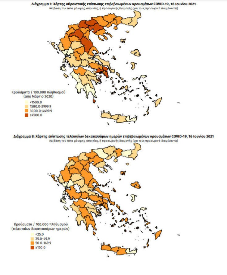 Ολοένα και πιο βελτιωμένη είναι η επιδημιολογική εικόνα της χώρας. Ο ΕΟΔΥ έδωσε στη δημοσιότητα την Τετάρτη 16 Ιουνίου 2021 τις τιμές για τον δείκτη θετικότητας ανά περιοχή.