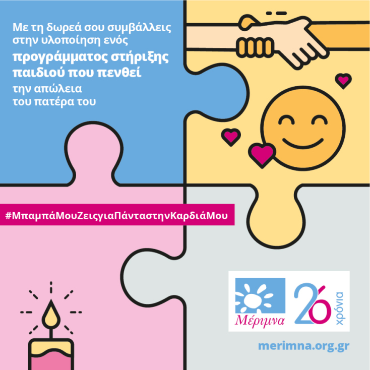 - Αν θέλετε μπορείτε να κάνετε μια δωρεά στη Μέριμνα για τη στήριξη παιδιών που βιώνουν την απώλεια του πατέρα στο σύνδεσμο #MpampaMou. Πληροφορίες: Ειρήνη Γκιουλάκου – Τμήμα Ανεύρεσης Πόρων – τηλ. 6936704226 E: fundraising@merimna.org.gr