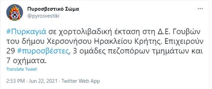 Φωτιά στις Γούβες Ηρακλείου Κρήτης - Ισχυρή παρουσία της Πυροσβεστικής Υπηρεσίας - Δεν απειλείται κατοικημένη περιοχή.
