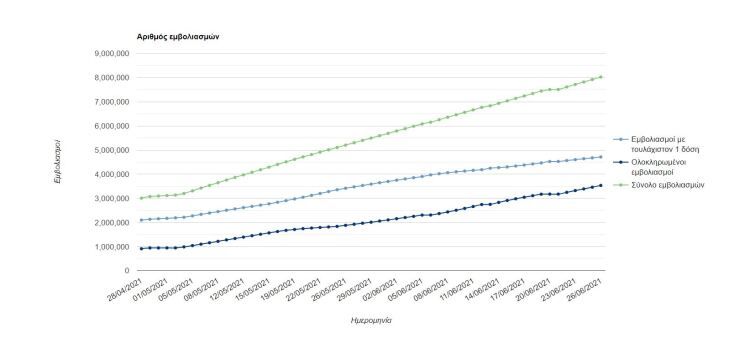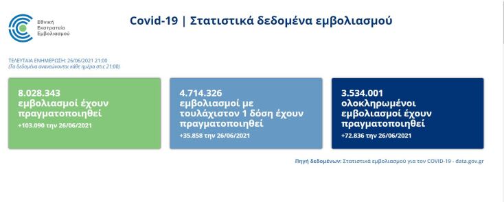 Σύμφωνα με τα νέα διαθέσιμα στοιχεία στην πλατφόρμα emvolio.gov.gr που δημοσιεύτηκαν το Σάββατο 26 Ιουνίου 2021, το τελευταίο 24ωρο έγιναν 103.090 εμβολιασμοί. Από την αρχή των εμβολιασμών έχουν χορηγηθεί 8.028.343 δόσεις των εμβολίων. Με τουλάχιστον 1 δόση έχουν εμβολιαστεί 4.714.326 (+35.858) και με δύο δόσεις 3.534.001 πολίτες (+72.836).