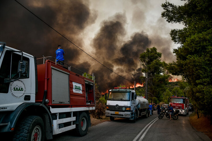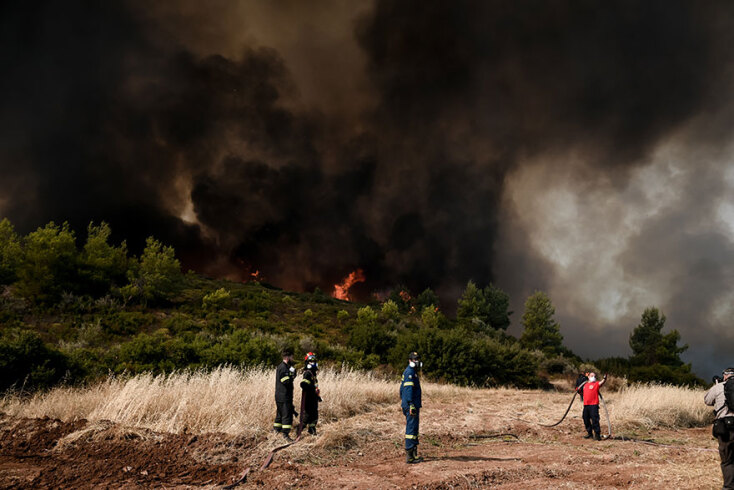 Οι καιρικές συνθήκες είναι αντίξοες με υψηλές θερμοκρασίες και ενισχυμένους ανέμους. Τα εναέρια μέσα επιχειρούν μέχρι το τελευταίο φως της ημέρας, συνδράμοντας το έργο της πυρόσβεσης, την ώρα που οι επίγειες δυνάμεις πασχίζουν να ελέγξουν τα πύρινα μέτωπα. Σε μια φωτογραφία που συγκινεί, εθελοντές πυροσβέστες στις Αφίδνες, βρίσκονται ξαπλωμένοι στο έδαφος, φορώντας τις στολές τους, προσπαθώντας να ξεκουραστούν για λίγη ώρα πριν ριχτούν εκ νέου στη μάχη με τις φλόγες.