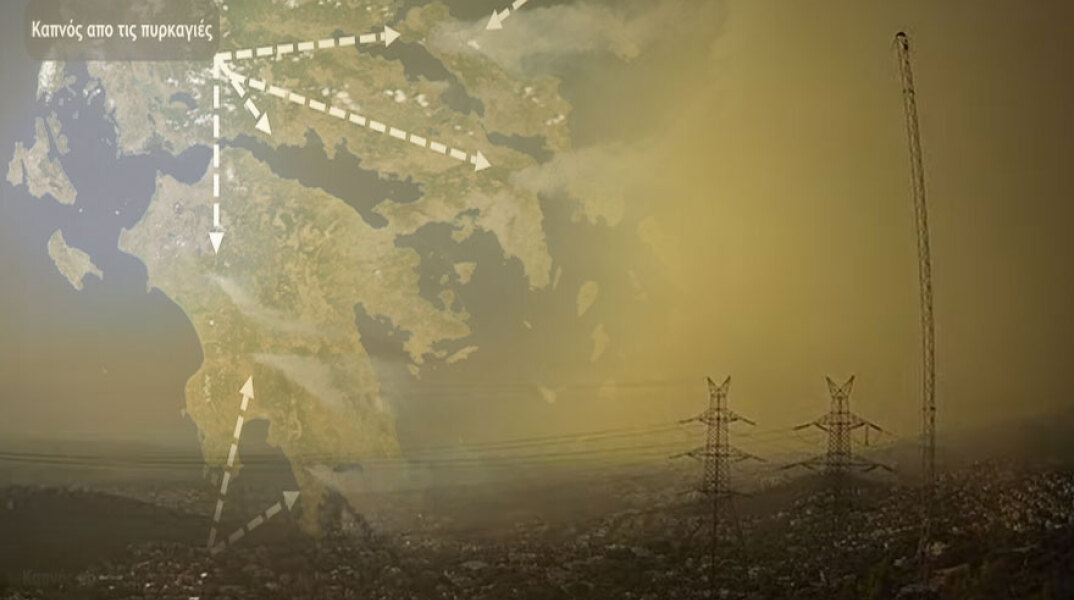 Οι δορυφορικές λήψεις δείχνουν τις μεγάλες εκτάσεις των πύρηνων μετώπων και τις εκτεταμένες ζώνες κάπνου να εκτείνονται προς τα ανατολικά πάνω απο το Αιγαίο ως αποτέλεσμα της ενίσχυσης των δυτικών ανέμων τις τελευταίες ώρες σε μεγάλο βάθος της τροπόσφαιρας.