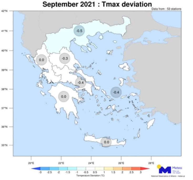 Ο φετινός Σεπτέμβριος χαρακτηρίστηκε από απότομες μεταβολές της θερμοκρασίας. Σε ορισμένες περιπτώσεις η άνοδος ή η πτώση της θερμοκρασίας σε διάστημα μικρότερο των 48 ωρών ξεπέρασε τους 13 βαθμούς Κελσίου. Πάντως, η ημερήσια μέγιστη θερμοκρασία σε 53 μετεωρολογικούς σταθμούς του Εθνικού Αστεροσκοπείου Αθηνών/meteo.gr κυμάνθηκε πολύ κοντά στον μέσο όρο της δεκαετίας 2010-2019, αν και η τελευταία δεκαετία αναφοράς ήταν αρκετά θερμότερη από τις προηγούμενες δεκαετίες.