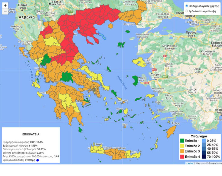 Ανανεώθηκε στο covid19.gov.gr ο επιδημιολογικός χάρτης Ελλάδας για την πανδημία κορωνοϊού σήμερα Τετάρτη 6 Οκτωβρίου 2021. Όπως ανακοινώθηκε, μπήκαν και επίσημα στο «κόκκινο» Καρδίτσα και Σέρρες, καθώς η διασπορά του ιού είναι μεγάλη.