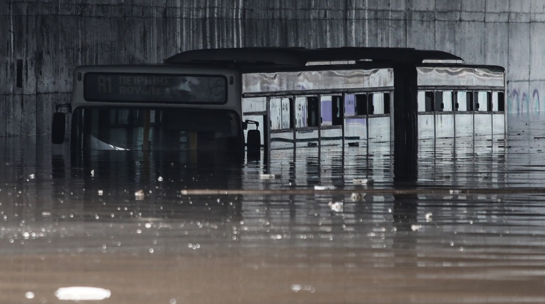 Τα έντονα καιρικά φαινόμενα που προκαλεί η κακοκαιρία «Μπάλλος» μετέτρεψαν σε ποτάμι τη γέφυρα στο ύψος του Ιδρύματος Σταύρος Νιάρχος, στην παλαιά Λεωφόρο Ποσειδώνος, με αποτέλεσμα να εγκλωβιστεί ένα λεωφορείο.