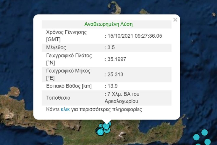Στις 09:27 σημειώθηκε δεύτερη σεισμική δόνηση για σήμερα, μεγέθους 3.5 Ρίχτερ, 7 χιλιόμετρα Βορειοανατολικά του Αρκαλοχωρίου, με εστιακό βάθος 13.9 χιλιόμετρα.