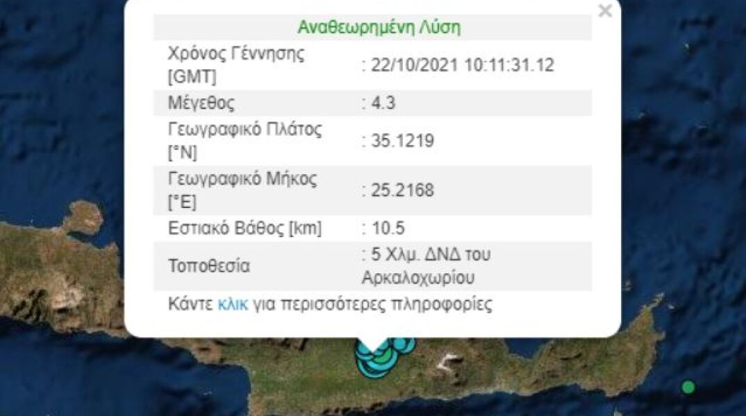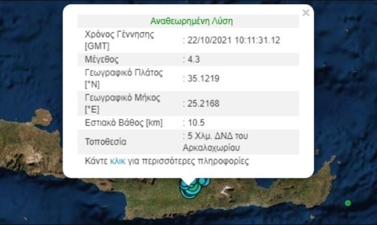 Σύμφωνα με την επίσημη ανακοίνωση από το Γεωδυναμικό Ινστιτούτο του Εθνικού Αστεροσκοπείου Αθηνών, ο νέος σεισμός στην Κρήτη εκδηλώθηκε 3 χλμ. νοτιοδυτικά από το Αρκαλοχώρι.