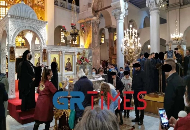 Άγιος Δημητρίος: Οι πιστοί βγάζουν τις μάσκες για να φιλήσουν την εικόνα στη Θεσσαλονίκη.