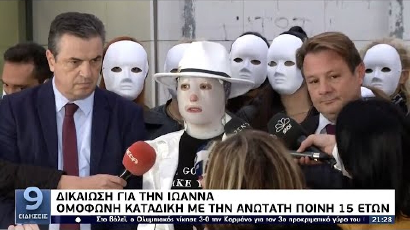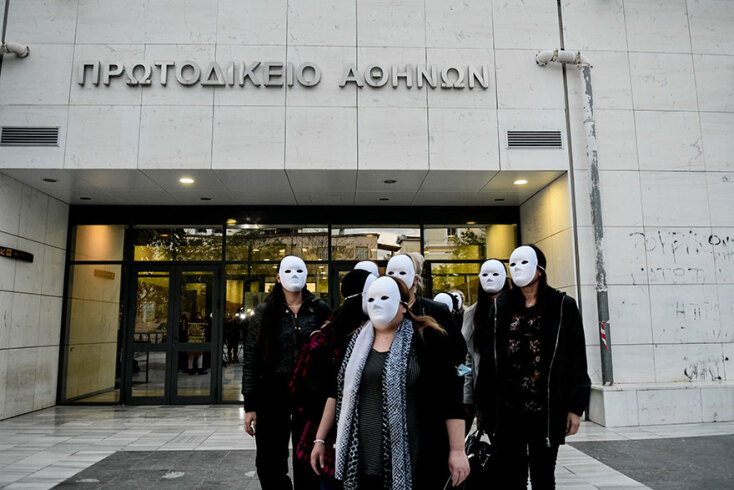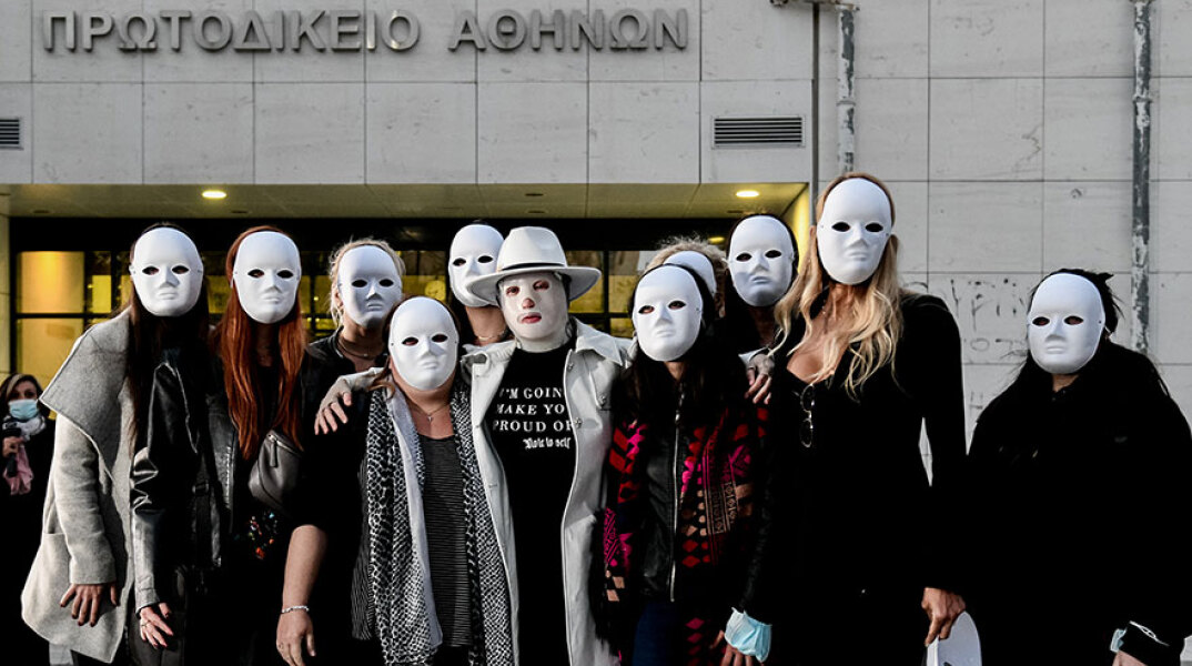 Με τις φίλες της, σε μια ένδειξη συμπαράστασης και αγάπης, να φορούν λευκές μάσκες στο πρόσωπό, η Ιωάννα Παλιοσπύρου έκανε δηλώσεις έξω από το δικαστήριο μετά το τέλος της δίκης για την επίθεση με το βιτριόλι.