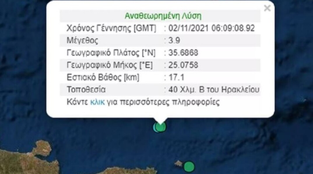 Νέος σεισμός σημειώθηκε νωρίς το πρωί της Τρίτης 2 Νοεμβρίου στο Ηράκλειο της Κρήτης. Σύμφωνα με το Γεωδυναμικό Ινστιτούτο, το μέγεθος της σεισμικής δόνησης ήταν 3,9 Ρίχτερ.