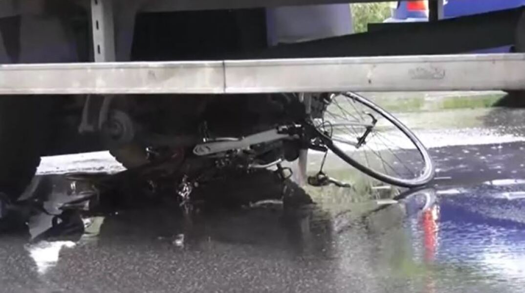 Τα πρώτα στιγμιότυπα που είδαν το «φως» της δημοσιότητας δείχνουν το ποδήλατο σφηνωμένο κάτω από το φορτηγό, ενώ λίγο πιο μακριά φαίνεται και το κράνος.