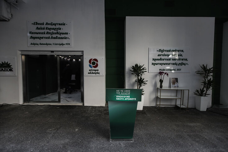 Όπως φαίνεται και στη φωτογραφίες, το σήμα του ΠΑΣΟΚ βρίσκεται σε περίοπτη θέση στην πρόσοψη του κτιρίου. Στην είσοδο, στα δεξιά, έχει τοποθετηθεί ένα stand κάτω από την επιγραφή με τα λόγια του Ανδρέα Παπανδρέου, ιδρυτή του ΠΑΣΟΚ. Πάνω σε αυτό υπάρχει μια φωτογραφία της Φώφης Γεννηματά.