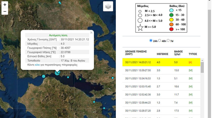 Σεισμός τώρα σημειώθηκε βόρεια από το Αίγιο, με το Γεωδυναμικό Ινστιτούτο να ανακοινώνει το επίκεντρο. Πόσο μετρήθηκε το βάθος σεισμού