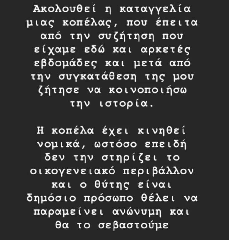 «Ακολουθεί η καταγγελία μίας κοπέλας που έπειτα από την συζήτηση που είχαμε εδώ και αρκετές εβδομάδες και μετά από την συγκατάθεσή της μου ζήτησε να κοινοποιήσω την ιστορία. Η κοπέλα έχει κινηθεί νομικά, ωστόσο επειδή δεν την στηρίζει το οικογενειακό περιβάλλον και ο θύτης είναι δημόσιο πρόσωπο, θέλει να παραμείνει ανώνυμη και θα το σεβαστούμε».