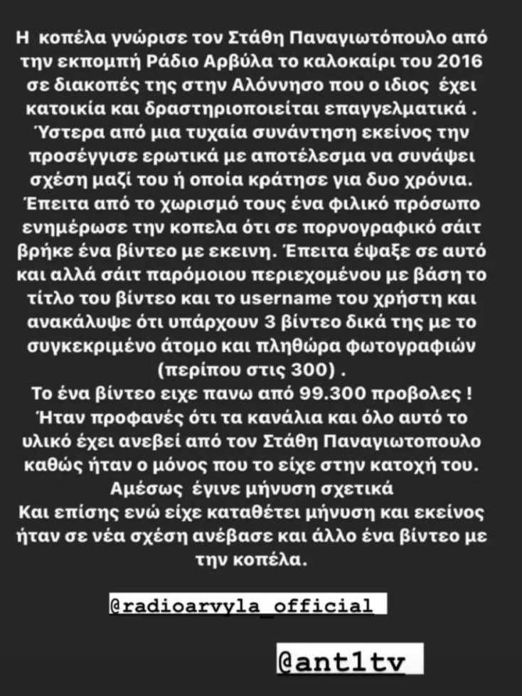 «Η κοπέλα γνώρισε τον Στάθη Παναγιωτόπουλο από την εκπομπή Ράδιο Αρβύλα το καλοκαίρι του 2016 σε διακοπές της στην Αλόνησσο, που ο ίδιος έχει κατοικία και δραστηριοποιείται επαγγελματικά. Ύστερα από μία τυχαία συνάντηση, εκείνος την προσέγγισε ερωτικά, με αποτέλεσμα να συνάψει σχέση μαζί του, η οποία κράτησε δύο χρόνια. Έπειτα το χωρισμό του, ένα φιλικό πρόσωπο ενημέρωσε την κοπέλα ότι σε πορνογραφικό σάιτ βρήκε ένα βίντεο με εκείνη. Έπειτα, έψαξε σε αυτό και άλλα σάιτ παρόμοιου περιεχομένου με βάση το τίτλο του βίντεο και το username του χρήστη και ανακάλυψε ότι υπάρχουν 3 βίντεο δικά της με το συγκεκριμένο άτομο και πληθώρα φωτογραφιών (περίπου 300). Το ένα βίντεο είχε πάνω από 99.300 προβολές. Ήταν προφανές ότι τα κανάλια και όλο αυτό το υλικό έχει ανέβει από τον Στάθη Παναγιωτόπουλο, καθώς ήταν ο μόνος που το είχε στην κατοχή του. Αμέσως έγινε μήνυση σχετικά και επίσης, ενώ είχε καταθέσει μήνυση και εκείνος ήταν σε νέα σχέση, ανέβασε και άλλο βίντεο με την κοπέλα», γράφει η καταγγελία.