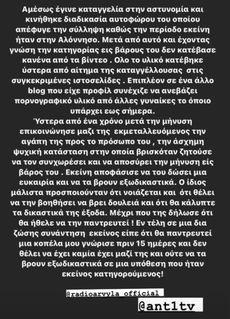 Στη συνέχεια, αναφέρεται: «Αμέσως, έγινε καταγγελία στην αστυνομία και κινήθηκε διαδικασία αυτοφώρου του οποίου απέφυγε τη σύλλυψη καθώς την περίοδο εκείνη ήταν στην Αλόνησσο. Μετά από αυτό και έχοντας γνώση την κατηγορία εις βάρος του δεν κατέβασε κανένα από τα βίντεο. Όλο το υλικό κατέβηκε ύστερα από αίτημα της καταγγέλουσας στις συγκεκριμένες ιστοσελίδες. Επιπλέον, σε ένα άλλο blog που είχε προφίλ, συνέχιζε να ανεβάζει πορνογραφικό υλικό από άλλες γυναίκες, το οποίο υπάρχει εώς σήμερα. Ύστερα από έναν χρόνο μετά τη μήνυση, επικοινώνησε μαζί της εκμεταλλευόμενος την αγάπη της προς το πρόσωπό του, την άσχημη ψυχική κατάσταση που βρισκόταν και ζητούσε να τον συγχωρέσει και να αποσύρει τη μήνυση εις βάρος του. Εκείνη αποφάσισε να του δώσει μία ευκαιρία και να τα βρουν εξωδικαστικά. Ο ίδιος μάλιστα, προσποιούνταν ότι νοιάζεται και ότι θέλει να τη βοηθήσει να βρει δουλειά και ότι θα κάλυπτε τα δικαστικά της έξοδα. Μέχρι που της δήλωσε ότι ήθελε να την παντρευτεί. Εν τέλει σε μία δια ζώσης συνάντηση εκείνος είπε ότι θα παντρευτεί μία κοπέλα που γνώρισε πριν 15 ημέρες και δεν θέλει να έχει καμία σχέση μαζί της και ούτε να τα βρουν εξωδικαστικά σε μία υπόθεση που ήταν εκείνος κατηγορούμενος».