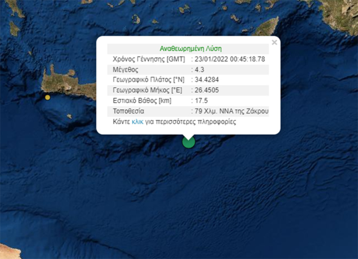 Η συγκεκριμένη δόνηση χαρακτηρίστηκε «ασθενής», με το επίκεντρό της να εντοπίζεται 79 χιλιόμετρα νότια-νοτιοανατολικά της Ζάκρου, στον νομό Λασιθίου, ενώ το εστιακό βάθος του σεισμού ήταν στα 17,5 χιλιόμετρα.