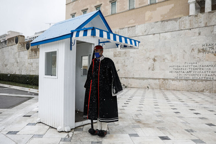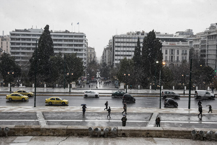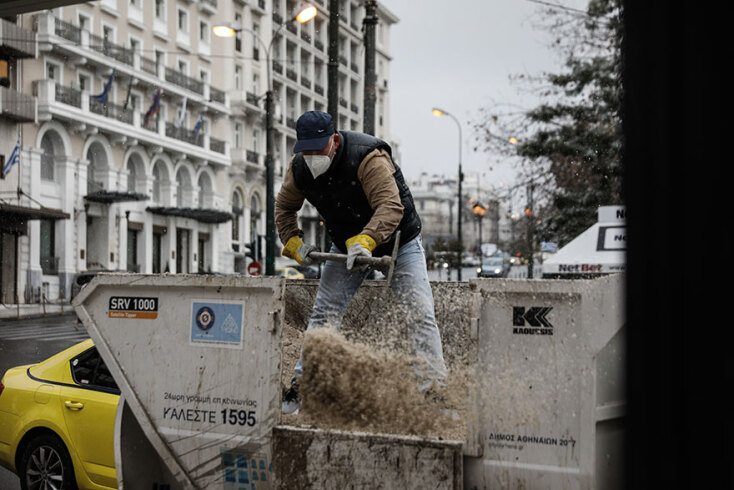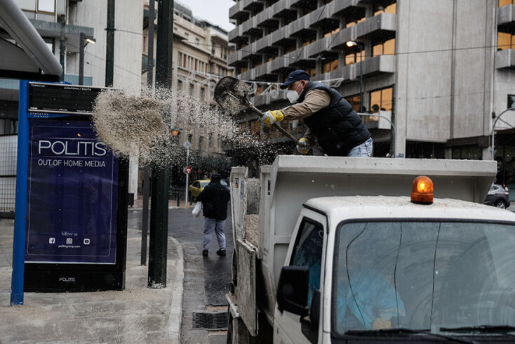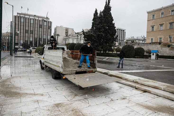 Η κακοκαιρία «Ελπίδα» έφερε χιόνια στο Σύνταγμα. Οι πρώτες εικόνες από τη χιονόπτωση στο κέντρο της Αθήνας. Υπάλληλοι του Δήμου Αθηναίων ρίχνουν αλάτι.