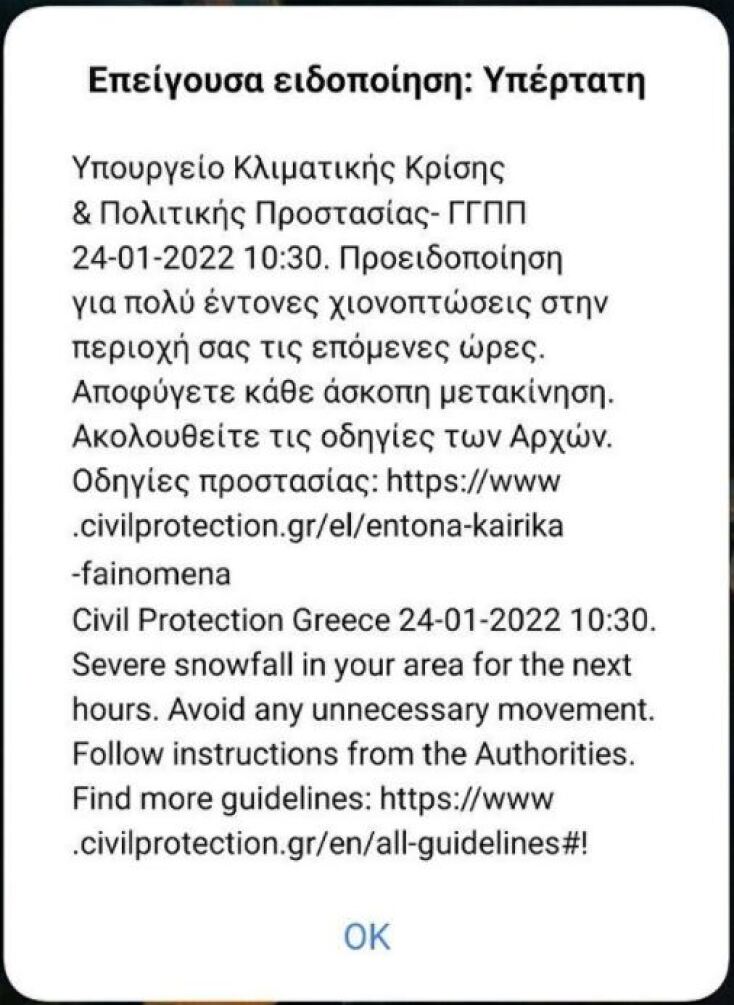 «Επείγουσα ειδοποίηση. Υπουργείο Κλιματικής Κρίσης & Πολιτικής Προστασίας - ΓΓΠΠ 24-01-2022 10:30. Προειδοποίηση για πολύ έντονες χιονοπτώσεις στην περιοχή σας τις επόμενες ώρες. Αποφύγετε κάθε άσκοπη μετακίνηση. Ακολουθείτε τις οδηγίες των Αρχών. Οδηγίες προστασίας: https://www.civilprotection.gr/el/entona-kairika-fainomena»
