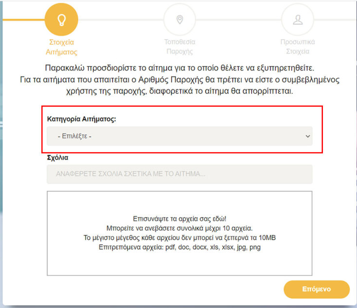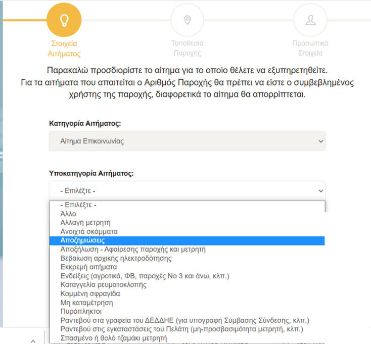 Στην επιλογή «Κατηγορία αιτήματος» (σ.σ. πρώτο κουτί) ο πολίτης επιλέγει «Αίτημα επικοινωνίας» και στην υποκατηγορία αιτήματος πατά την επιλογή «Αποζημιώσεις», όπως φαίνεται στις ακόλουθες εικόνες.