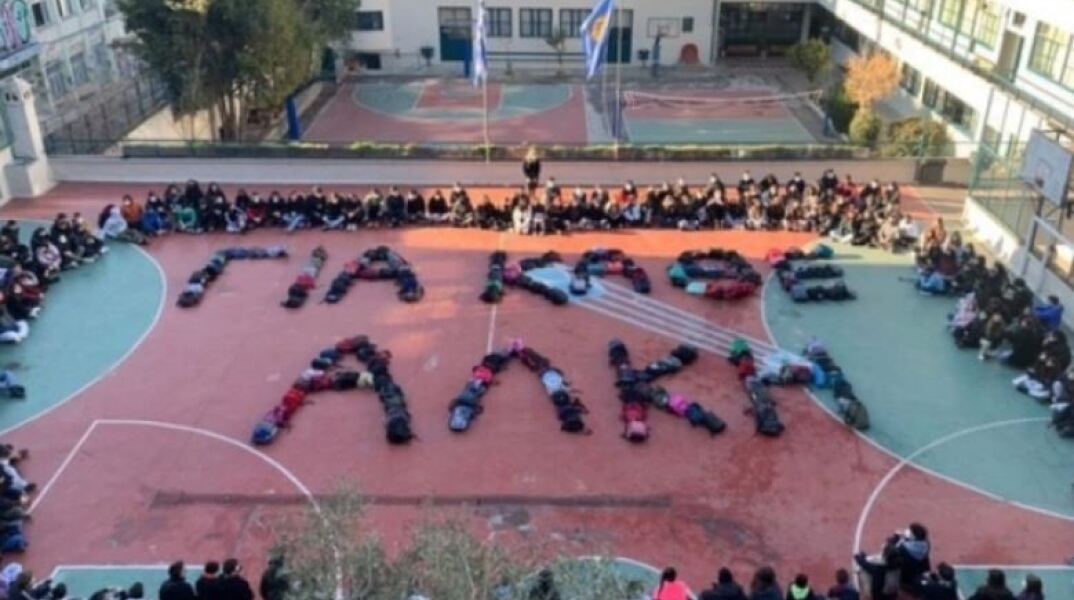 Σχημάτισαν τη φράση με τις τσάντες τους στο προαύλιο του Πειραματικού Σχολείου Πανεπιστημίου Θεσσαλονίκης