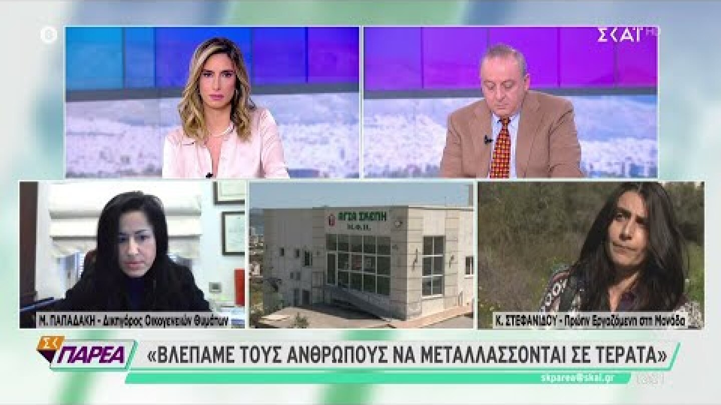 «Δίναμε τα κατασταλτικά φάρμακα σαν καραμέλες στους ανθρώπους και ρωτούσαμε τι είναι αυτά» ανέφερε η πρώην εργαζόμενη, σημειώνοντας πως η ίδια έχει καταθέσει στις Αρχές ότι όλοι πέθαιναν με τον ίδιο τρόπο. «Τρεις μέρες εμπύρετοι ήξεραν ότι θα πεθάνουν και μάλιστα γελούσαν, έφευγαν από το δωμάτιο και τους αφήναν μόνους τους. Την ώρα που έφευγε η ψυχή τους καθόμουν στο δωμάτιο για να τους κρατάω στο χέρι. Για να μην νιώθουν μοναξιά» ανέφερε χαρακτηριστικά η Κική Στεφανίδου για τις τραγικές στιγμές που βίωναν οι ηλικιωμένοι.