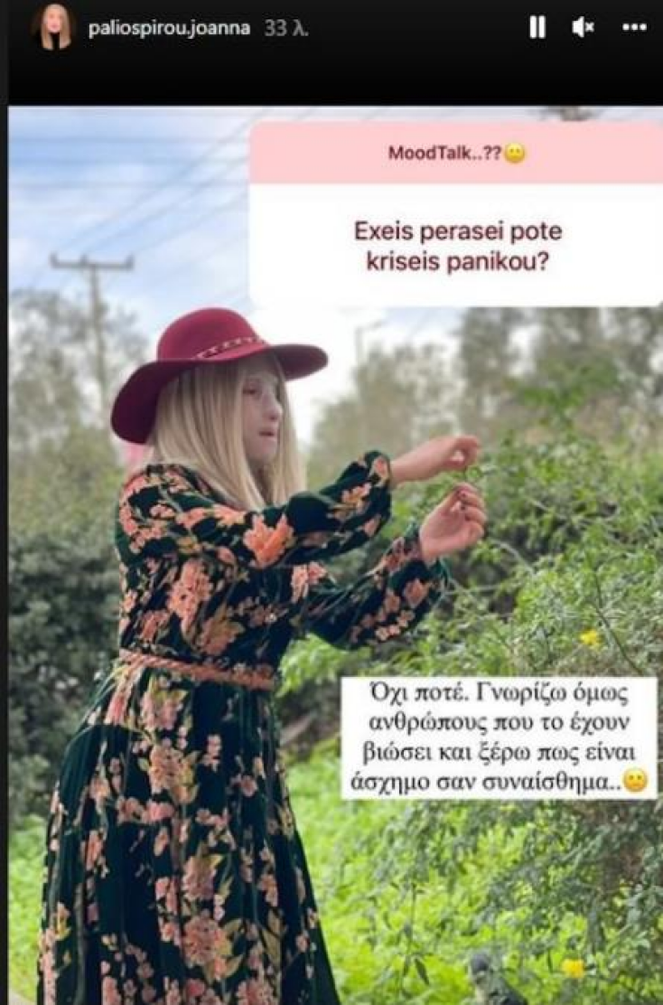 Σε ερώτηση για το αν έχει αντιμετωπίσει ποτέ κρίσεις πανικού η ίδια απάντησε αρνητικά, ενώ τόνισε ότι η αυτοπεποίθησή της παραμένει στα ύψη καθώς γι’αυτό φροντίζουν οι άνθρωποι που είναι γύρω της και της δίνουν κουράγιο.