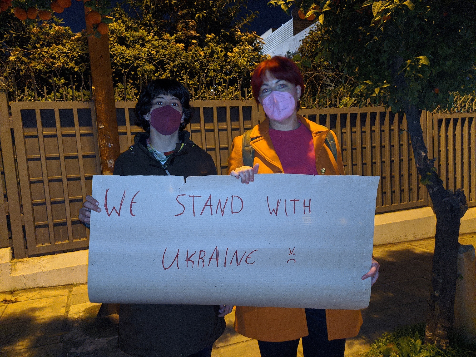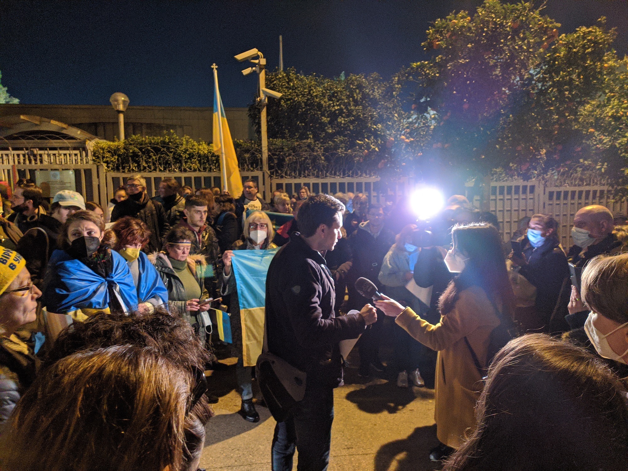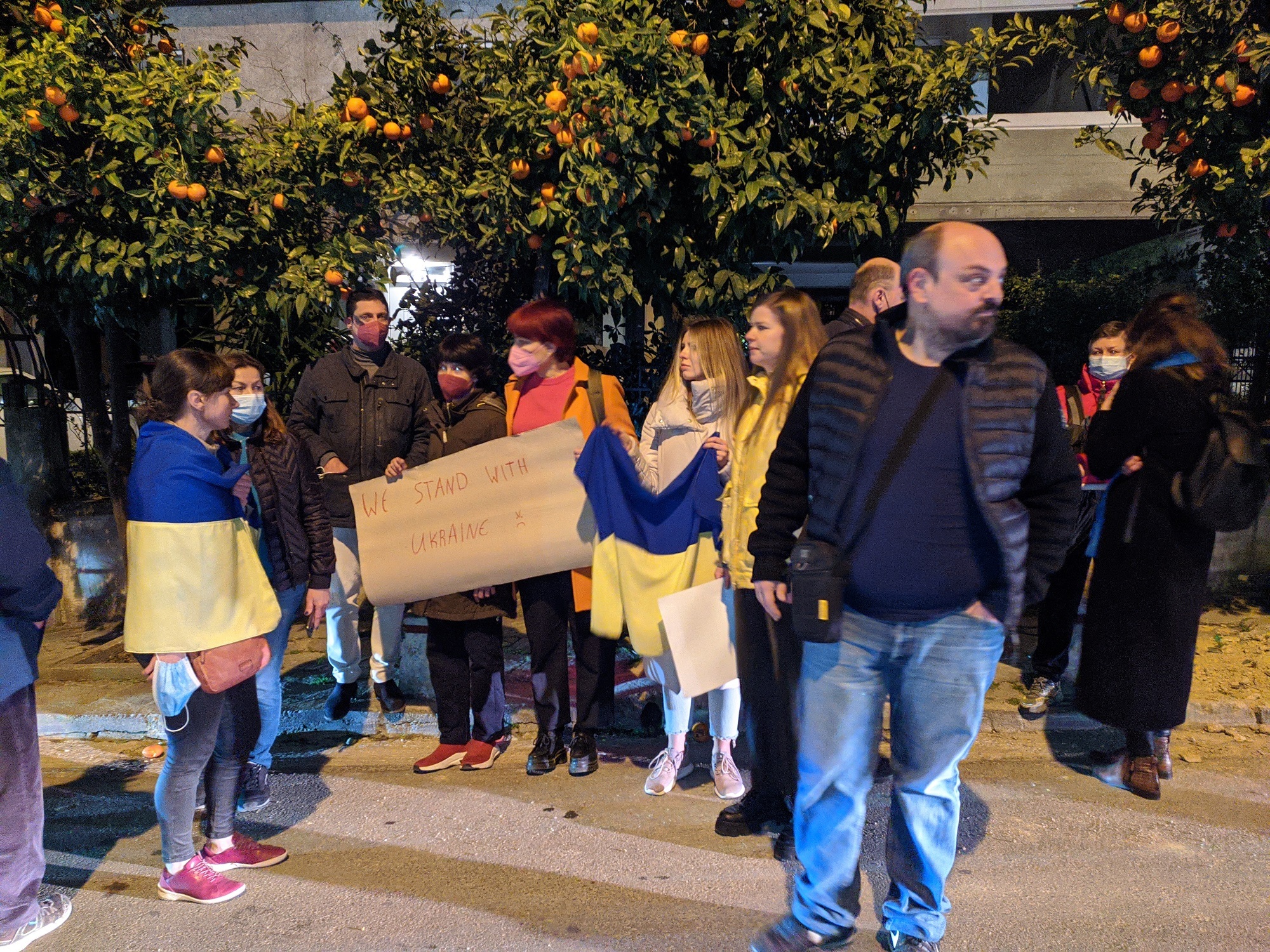 Μικρή αυθόρμητη διαδήλωση έγινε το βράδυ της Παρασκευής έξω από το προξενείο της Ρωσίας στην οδό Τζαβέλλα στο Νέο Ψυχικό. Η ιδέα, που δεν είναι γνωστό από ποιον ξεκίνησε, άρχισε να κυκλοφορεί αργά το απόγευμα στο FB, και τελικά γύρω στις 19.30 μαζεύτηκαν περίπου 100 άτομα. Όχι λίγα, για μία ακομμάτιστη αυθόρμητη εκδήλωση. Έλληνες και Ουκρανοί, με πραγματική συγκίνηση, διαδήλωσαν ήσυχα.