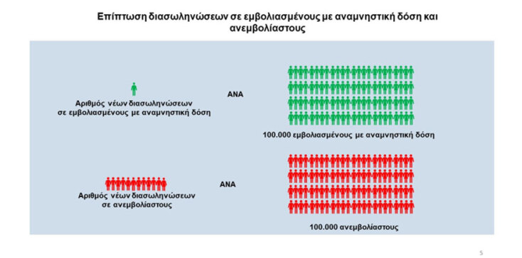 Η παραπάνω περίοδος αφορά το χρονικό διάστημα που κυριάρχησε το στέλεχος Όμικρον στην Ελλάδα. Όπως προκύπτει από την ανάλυση των στοιχείων, η αποτελεσματικότητα που είχε η αναμνηστική δόση σε σχέση με τους ανεμβολίαστους ή μερικώς εμβολιασμένους ήταν: