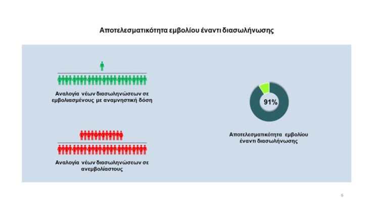 - Η αποτελεσματικότητα του εμβολιασμού με αναμνηστική δόση είναι ακόμα μεγαλύτερη έναντι σοβαρής νόσου (διασωλήνωσης) και θανάτου, υποδεικνύοντας τα μεγάλα πλεονεκτήματα του εμβολιασμού στην Ελλάδα έναντι ενός στελέχους με πολλές μεταλλάξεις και ικανότητα διαφυγής από προϋπάρχουσα ανοσία.