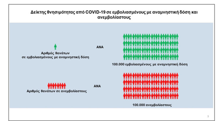 Στα στοιχεία που παρουσιάζει ο ΕΟΔΥ περιλαμβάνεται και ο δείκτης θνησιμότητας από κορωνοϊό σε σχέση με την αποτελεσματικότητα εμβολίου σε εμβολιασμένους με αναμνηστική δόση και ανεμβολίαστους ή μερικώς εμβολιασμένους. Ειδικότερα: