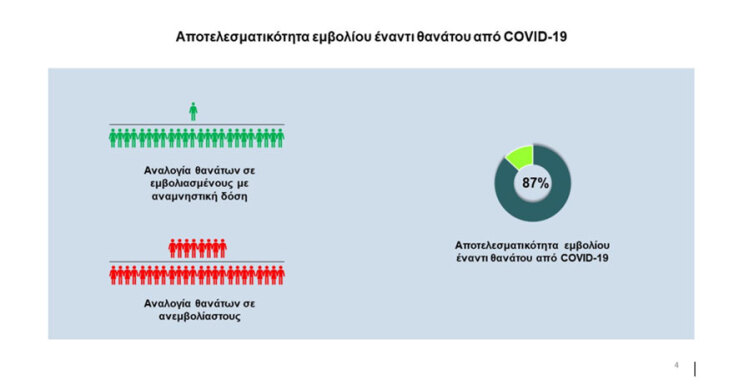 Η αποτελεσματικότητα του εμβολίου (αναμνηστική δόση) έναντι θανάτου από COVID-19 εκτιμήθηκε σε 87% σε σχέση με τους ανεμβολίαστους ή μερικώς εμβολιασμένους