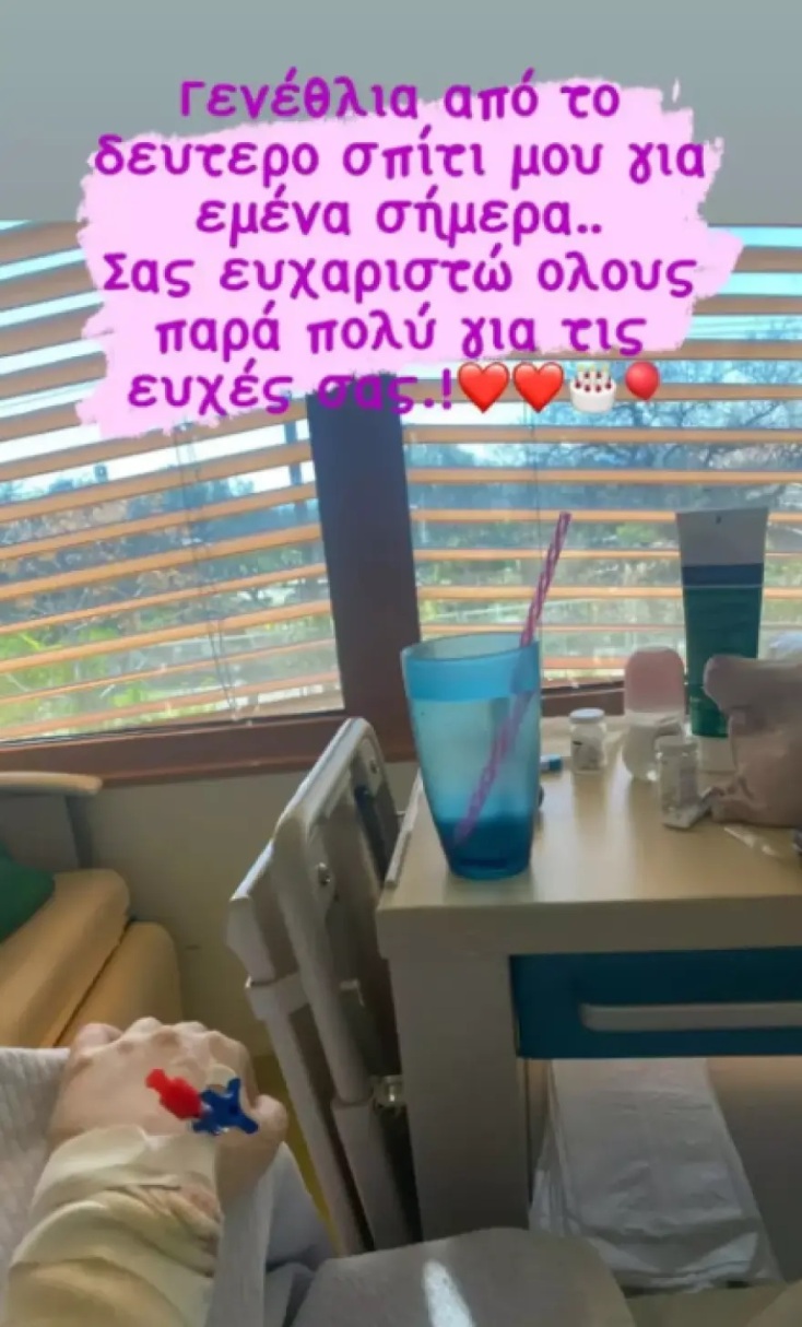 Πιο συγκεκριμένα, δημοσίευσε μία φωτογραφία μέσα από το νοσοκομείο και τη συνόδευσε γράφοντας: «Γενέθλια από το δεύτερο σπίτι μου για εμένα σήμερα. Σας ευχαριστώ όλους πάρα πολύ για τις ευχές σας».