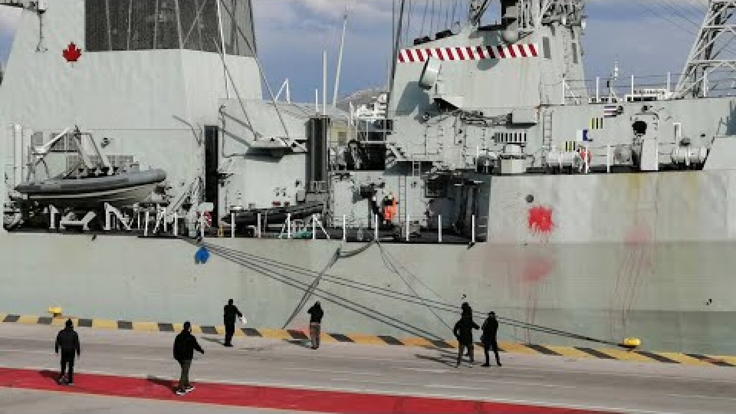 Στη συνέχεια πέταξαν μπογιές στη φρεγάτα του Καναδά «HCMS MONTREAL FFH336», φωνάζοντας συνθήματα κατά του ΝΑΤΟ. «Οι δυνάμεις του ΚΚΕ και της ΚΝΕ δίνουν λίγο χρώμα στο νατοϊκό πλοίο των μακελάρηδων» ανέφεραν.