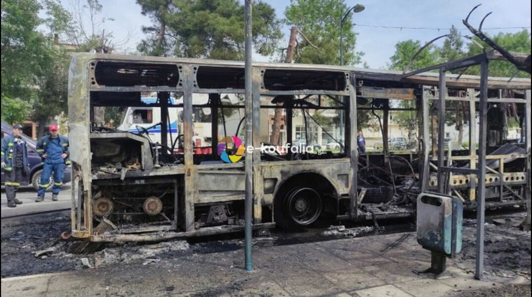 Αστικό λεωφορείο καταστράφηκε ολοσχερώς ύστερα από φωτιά που εκδηλώθηκε, καθώς αυτό κινείτο στην περιοχή του Αγίου Αθανασίου, στη Θεσσαλονίκη.