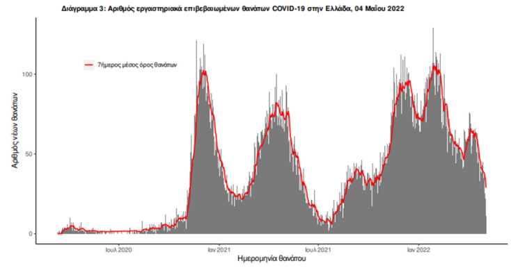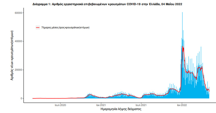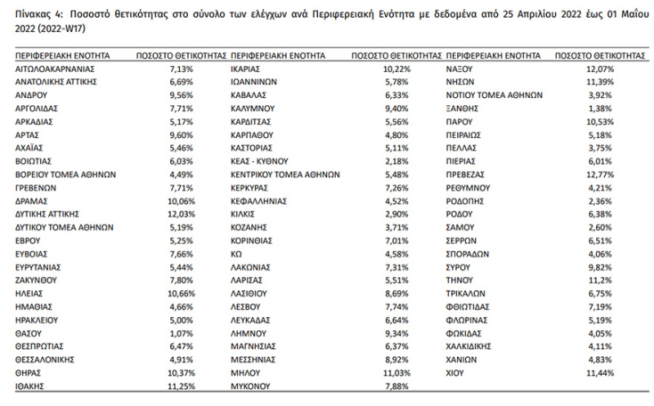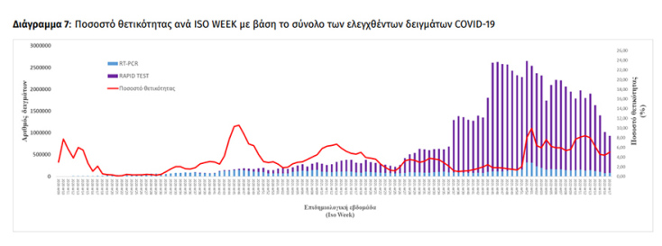 Την εβδομάδα αναφοράς (25 Απριλίου - 01 Μαΐου 2022) το ποσοστό θετικότητας ήταν 5,05% σε σύνολο 931.267 εργαστηριακών ελέγχων (RT-PCR/Rapid-Ag).