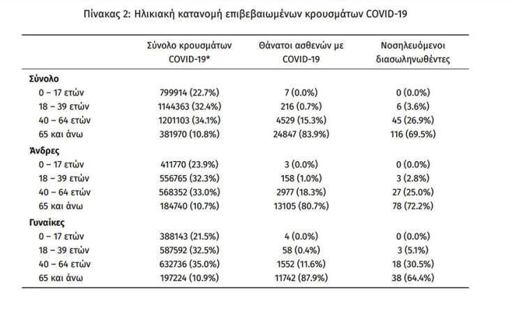 «Τα νέα εργαστηριακά επιβεβαιωμένα κρούσματα της νόσου (άτομα) που καταγράφηκαν τις τελευταίες 24 ώρες ήταν 6.252. Ο συνολικός αριθμός των ατόμων που νόσησαν ανέρχεται σε 3.401.927 (ημερήσια μεταβολή +0.2%), εκ των οποίων 48.8% άνδρες.