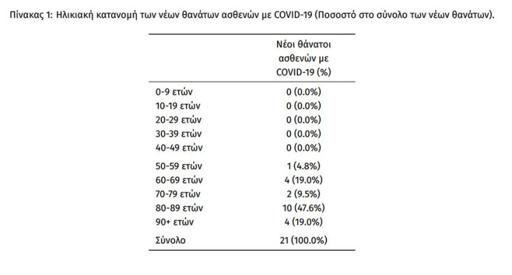 Οι νέοι θάνατοι ασθενών με COVID-19 είναι 21, ενώ από την έναρξη της επιδημίας έχουν καταγραφεί συνολικά 29.599 θάνατοι. Το 95.6% είχε υποκείμενο νόσημα ή/και ηλικία 70 ετών και άνω.