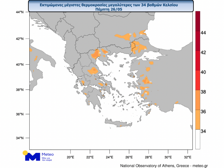Η θερμοκρασία θα σημειώσει περαιτέρω άνοδο σε πάνω από τα φυσιολογικά για την εποχή επίπεδα, σύμφωνα με το meteo του Εθνικού Αστεροσκοπείου Αθηνών, και θα κυμανθεί στη Δυτική Μακεδονία από 13 έως 32 βαθμούς, στην υπόλοιπη Βόρεια Ελλάδα από 13 έως 37, στην Ήπειρο από 11 έως 33 βαθμούς στη Θεσσαλία από 13 έως 36, στα υπόλοιπα ηπειρωτικά από 12 έως 36 βαθμούς, στα νησιά του Ιονίου από 12 έως 32 και στα νησιωτικά τμήματα του Αιγαίου και στην Κρήτη από 11 έως 34 βαθμούς και στα νησιά του Νοτιοανατολικού Αιγαίου έως 35 βαθμούς Κελσίου.