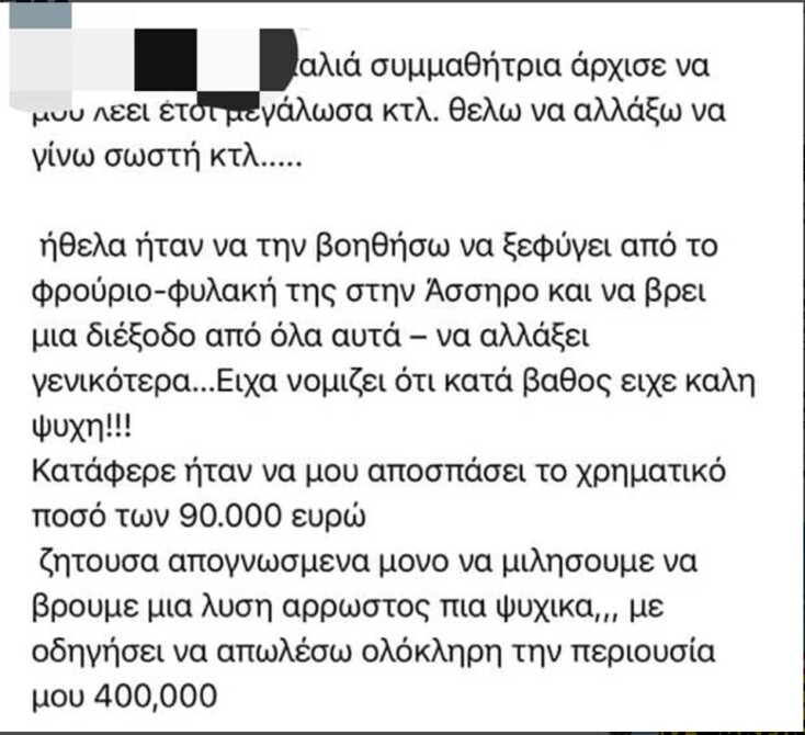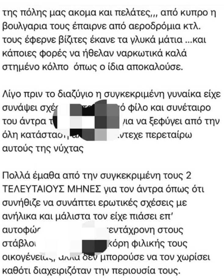 Πληροφορίες του Mega αναφέρουν ότι ο 50χρονος γυμναστής, με μέιλ που είχε στείλει σε γνωστούς του αναφερόταν σε μία γυναίκα με την οποία διατηρούσε ερωτική σχέση και όπως υποστήριζε τον είχε εξαπατήσει, αρπάζοντάς του 500.000 ευρώ. Μετά εξαφανίστηκε. Άνθρωποι που τους γνωρίζουν φαίνεται ότι έχουν καταλάβει σε ποια γυναίκα αναφέρεται. Ο 50χρονος καταγγέλλει επίσης κυκλώματα εκβιασμών και μαστροπείας, με συμμετοχή ανήλικων κοριτσιών και της γυναίκας που τον εκβίαζε.