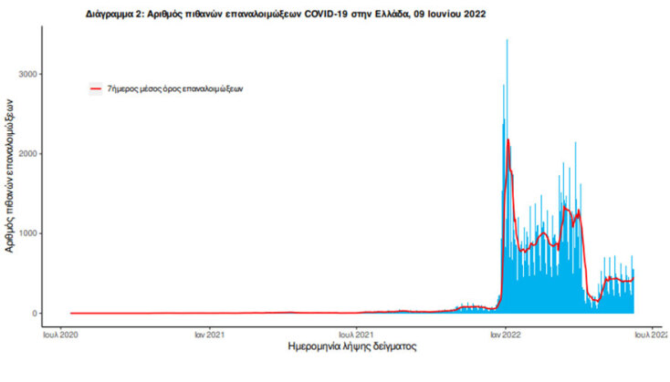 Ο αριθμός πιθανών νέων επαναλοιμώξεων που καταγράφηκαν τις τελευταίες 24 ώρες ήταν 545 ενώ από την αρχή της πανδημίας SARS-CoV-2 ο συνολικός αριθμός εκτιμάται σε 140.146 (3.9% του συνολικού αριθμού των θετικών αποτελεσμάτων).