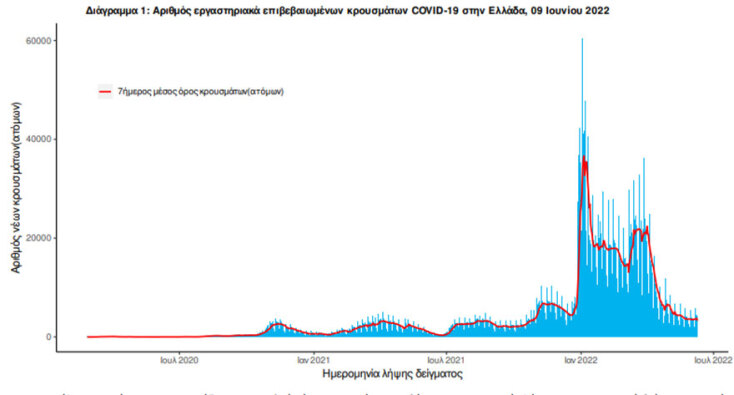Τα νέα κρούσματα κορωνοϊού σήμερα, Πέμπτη 9 Ιουνίου 2022, ανακοίνωσε ο ΕΟΔΥ. Στην ανακοίνωση του για τον κορωνοϊό και την πανδημία στην Ελλάδα αναφέρονται επίσης οι εισαγωγές στα νοσοκομεία, οι θάνατοι, οι διασωληνωμένοι με Covid-19 στις ΜΕΘ και οι επαναλοιμώξεις.