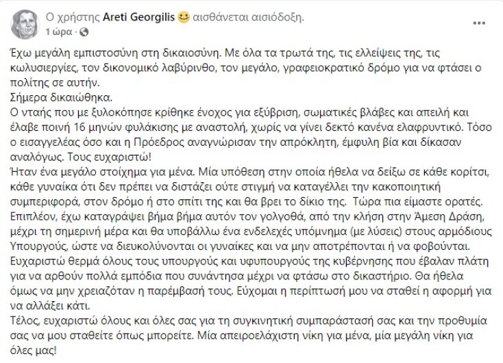 Αρετή Γεωργιλή: Η ανάρτηση της ιδιοκτήτριας του Free Thinking Zone για την ενοχή του δράστη του δημόσιου ξυλοδαρμού της και την ποινή που του επιβλήθηκε.