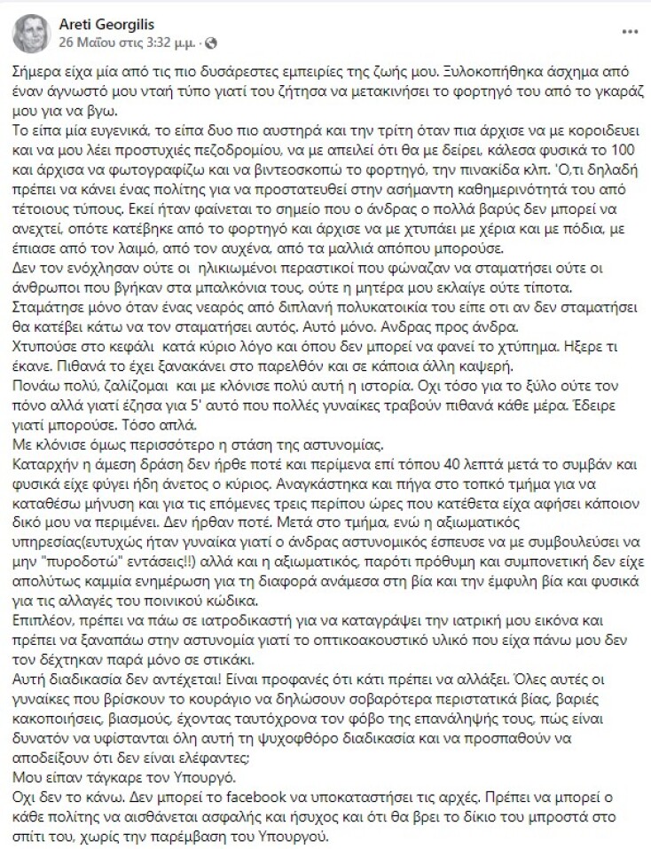 Την επίθεση και τον ξυλοδαρμό που υπέστη σε δημόσια θέα είχε καταγγείλει πριν από δύο εβδομάδες η Αρετή Γεωργιλή. «Σήμερα είχα μία από τις πιο δυσάρεστες εμπειρίες της ζωής μου. Ξυλοκοπήθηκα άσχημα από έναν άγνωστό μου νταή τύπο γιατί του ζήτησα να μετακινήσει το φορτηγό του από το γκαράζ μου για να βγω», αναφέρει στην ανάρτησή της η κα Γεωργιλή.
