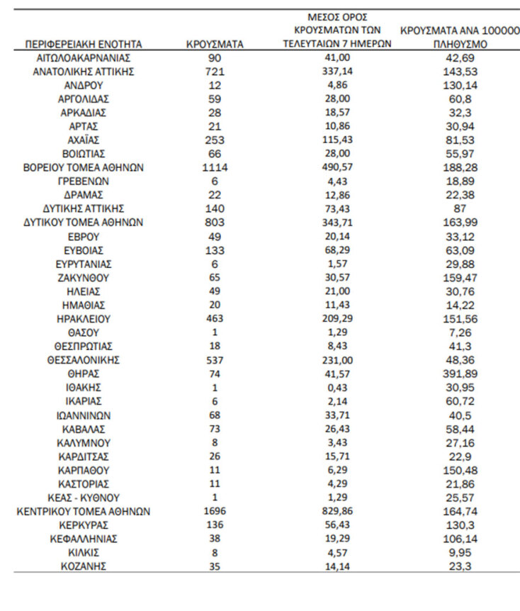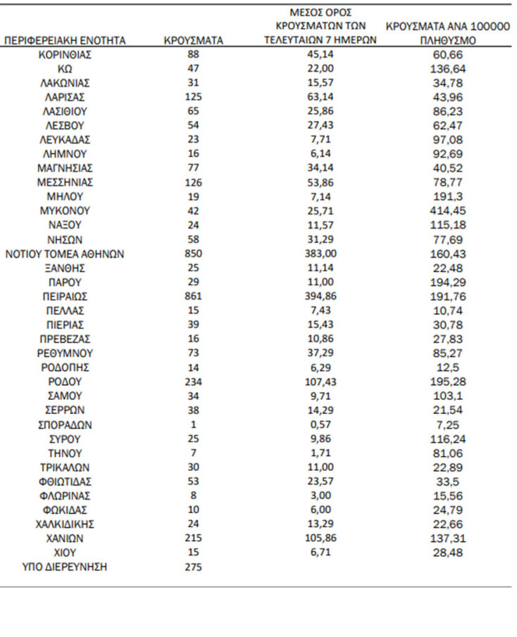 Κατανομή για τα κρούσματα σήμερα Τετάρτη (15/6) - Οι πίνακες του ΕΟΔΥ