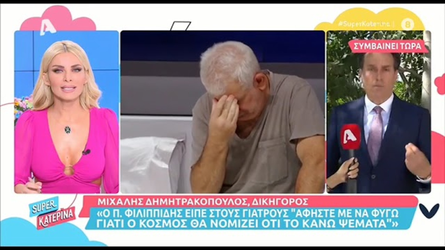 «Οι γιατροί αποφάσισαν να νοσηλευτεί, όμως εκείνος έγινε ότι έχει δικαστήριο σήμερα και θέλει να εμφανιστεί για να μη νομίζουν ότι παίζει θέατρο. Οι γιατροί αρνήθηκαν, εκτός κι αν υπέγραφε για αν βγει. Υπόγραψε και χθες βράδυ είχε έξαρση η κατάστασή του, έγινε διακομιδή στο νοσοκομείο και θα γίνει και επέμβαση γιατί η κατάστασή του είναι σοβαρή. Έχει μια αρρώστια που από την ίδια πέθανε ο πατέρας του στα 62. Το εγκεφαλικό είναι έμφρακτο, αν αιμορραγήσει το αγγείο στο κεφάλι τότε μπορεί να πεθάνει».