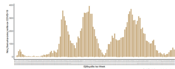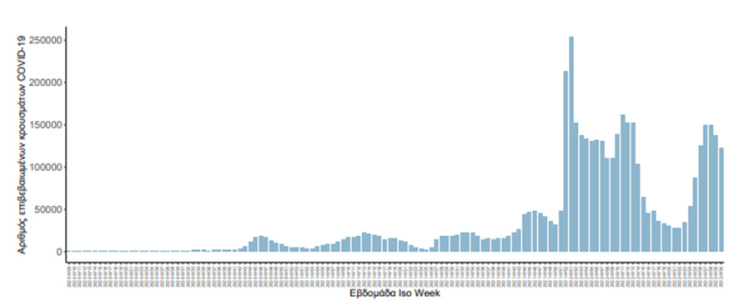 «Την εβδομάδα αναφοράς καταγράφηκαν 122.230 κρούσματα COVID-19 (11.716 ανά εκατομμύριο πληθυσμού: -11% εβδομαδιαία μεταβολή) εκ των οποίων οι επαναλοιμώξεις αφορούν το 20% των λοιμώξεων. Ο συνολικός αριθμός των λοιμώξεων από την έναρξη της πανδημίας ανέρχεται σε 4.474.616 εκ των οποίων 51.8% γυναίκες.