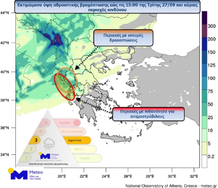 Ο παρακάτω χάρτης δείχνει τον αθροιστικό υετό που αναμένεται κατά την διάρκεια της Δευτέρας 26/09 έως το μεσημέρι της Τρίτης 27/09 και συνοψίζει τις κυριότερες περιοχές υψηλού κινδύνου.
