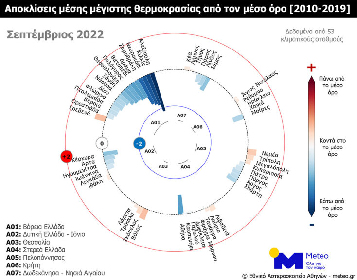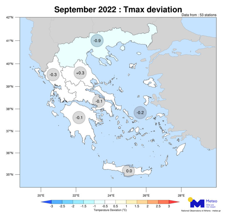 Οι μεγαλύτερες θερμοκρασιακές αποκλίσεις καταγράφηκαν στην Αλεξανδρούπολη, όπου η θερμοκρασία κυμάνθηκε έως και 8,4°C χαμηλότερα από τα κανονικά για την εποχή επίπεδα μεταξύ 19 και 27 Σεπτεμβρίου 2022, ενώ συνολικά τις 24 από τις 30 ημέρες του μήνα καταγράφηκαν αρνητικές αποκλίσεις.